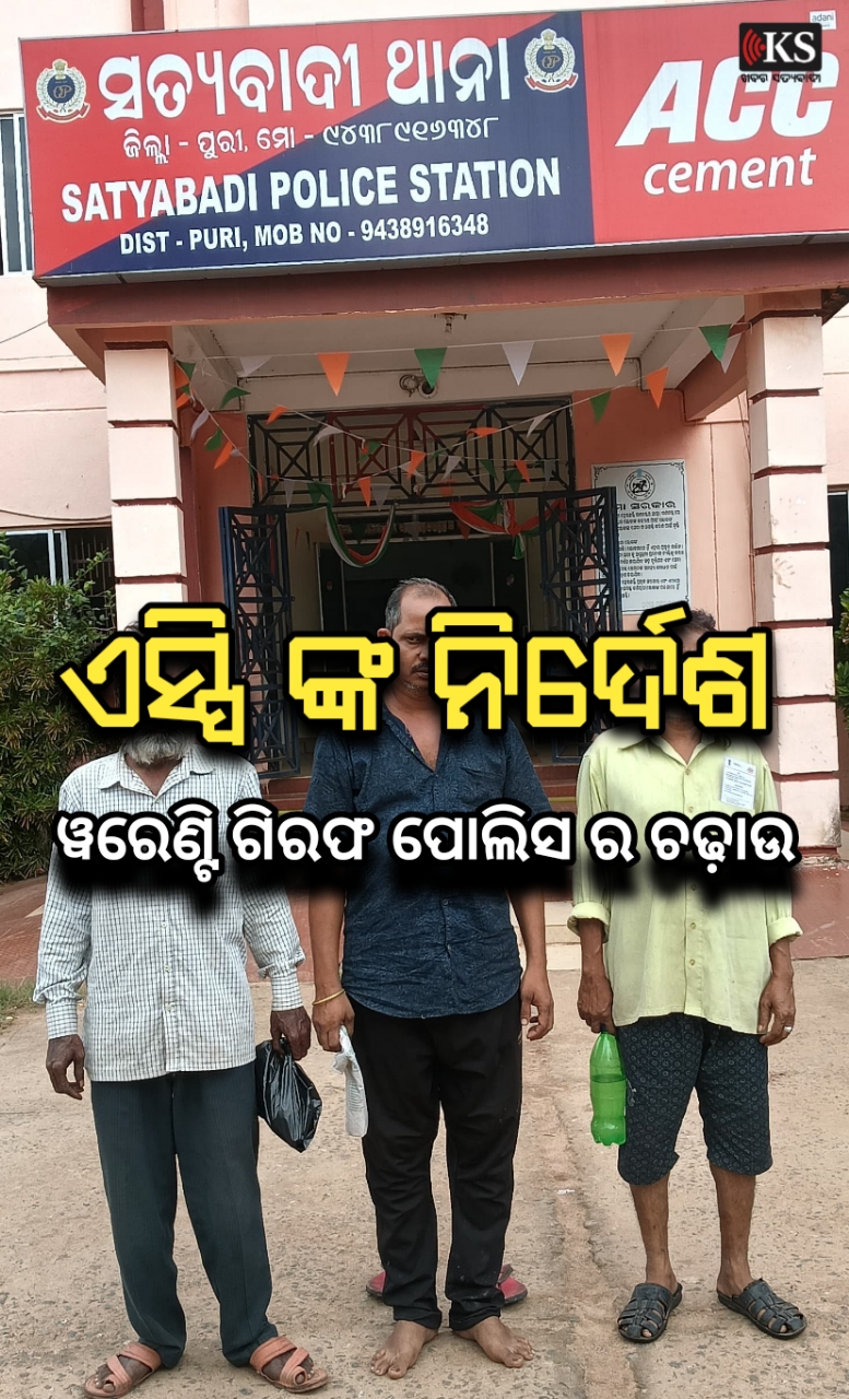 ଏସପି ପୁରୀଙ୍କ ନିର୍ଦ୍ଦେଶ କ୍ରମେ ଚାଲିଥିବା ଅପରେସନ ଚକରା ଆଧାରରେ NBW ଡ୍ରାଇଭ ରେ ସତ୍ୟବାଦୀ ଥାନା ପକ୍ଷରୁ ଚଢାଉ କରାଯାଇ ତିନି ଜଣ ଅପରାଧିଙ୍କୁ ୱାରେଣ୍ଟ ବଳରେ ଗିରଫ କରା ଯାଇଛି।
